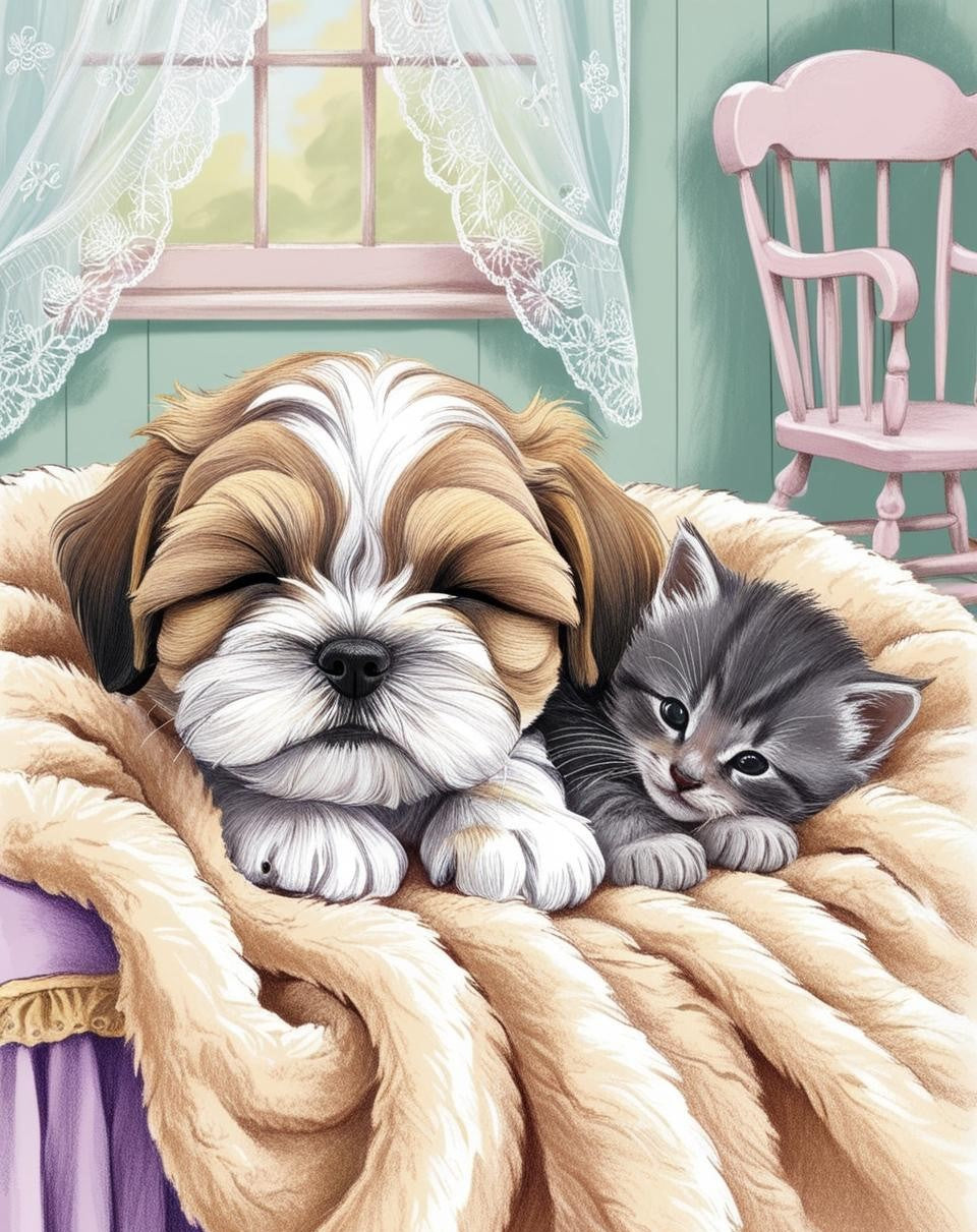 With our stunning paint by number kits, you'll be able to create beautiful artwork for your enjoyment, to enhance your home, and create true masterpieces. Each paint by number kit has brushes, numbered paints, and an easy-to-follow reference guide. Get started today with this beautiful Paint by Number Adorable Pals.