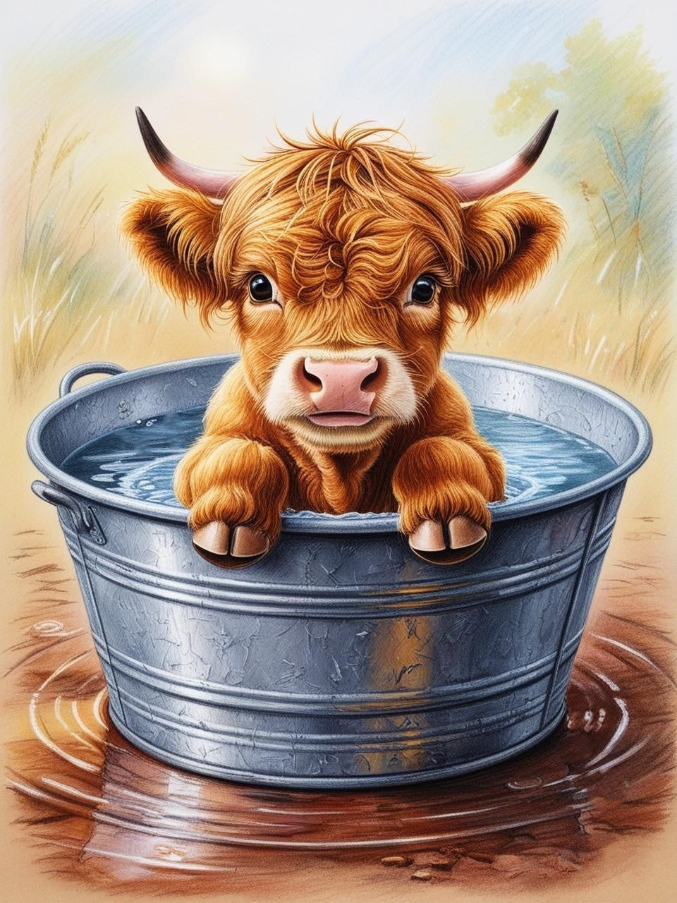 Adorable Tub Time - Baby Highland Cow in a Wash Basin Paint by Number