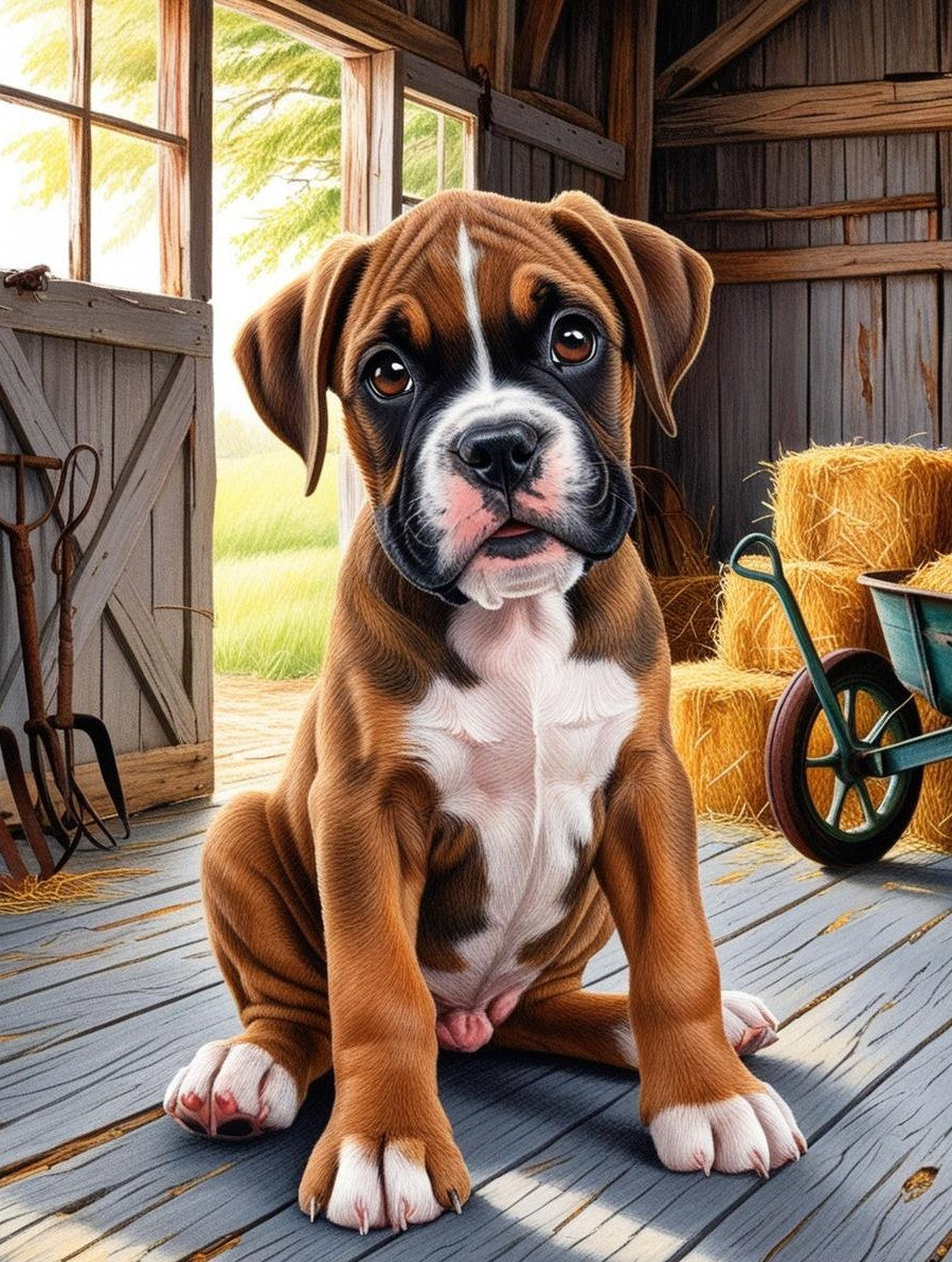 With our stunning paint by number kits, you'll be able to create beautiful artwork for your enjoyment, to enhance your home, and create true masterpieces. Each paint by number kit has brushes, numbered paints, and an easy-to-follow reference guide. Get started today with this beautiful Paint by Number Curious Boxer Pup in the Barn.